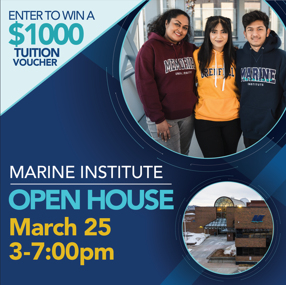 Marine Institute is hosting an Open House on March 25. Meet faculty, admissions, student supports, housing, and student aid teams—and enter for a chance to win a $1,000 tuition voucher.Fisheries and Marine Institute, Memorial University