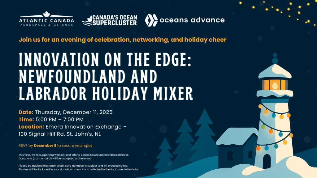 The Atlantic Canada Aerospace and Defence Association, Canada’s Ocean Supercluster, and Oceans Advance are pleased to invite you to the 2025 Holiday Reception, taking place on December 11 from 5:00–7:00 PM at the Emera Innovation Exchange, Signal Hill Campus.
